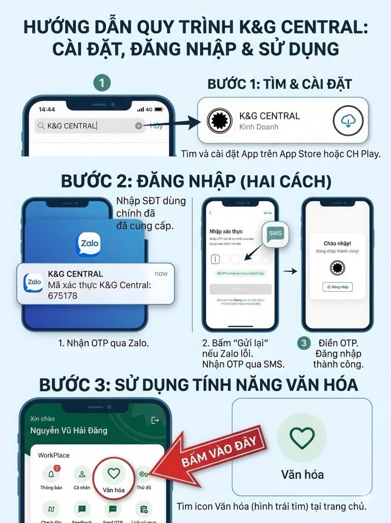 K&G Central sẽ chỉ thực sự phát huy giá trị khi có sự tham gia của mỗi KGer. Mỗi lượt tải app, mỗi lần ghi nhận, mỗi lời biết ơn hay chia sẻ đều là một viên gạch góp phần xây dựng nên văn hóa chung của K&G Việt Nam. Hãy bắt đầu ngay hôm nay bằng việc cài đặt K&G Central, tạo một môi trường làm việc gắn kết, chủ động nơi mà mọi nỗ lực, kết quả đều được lan tỏa và trân trọng.
